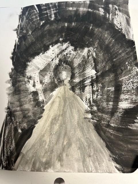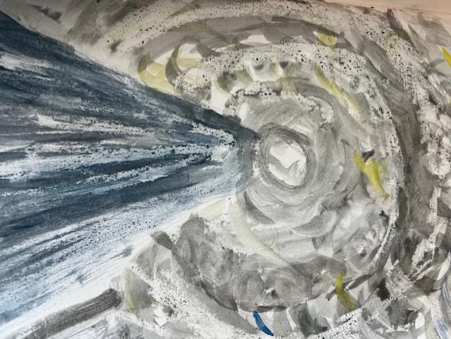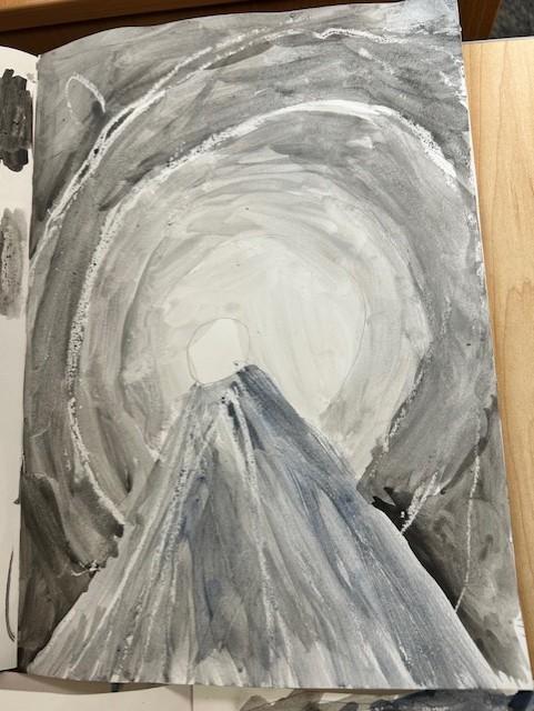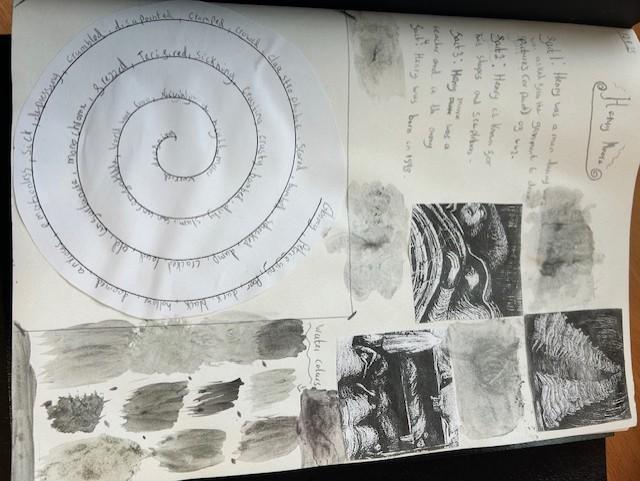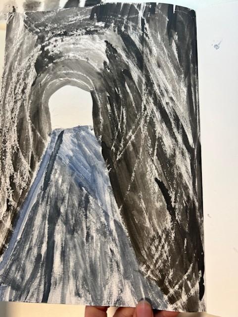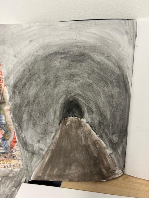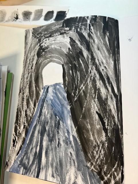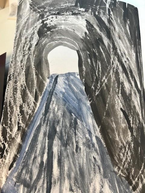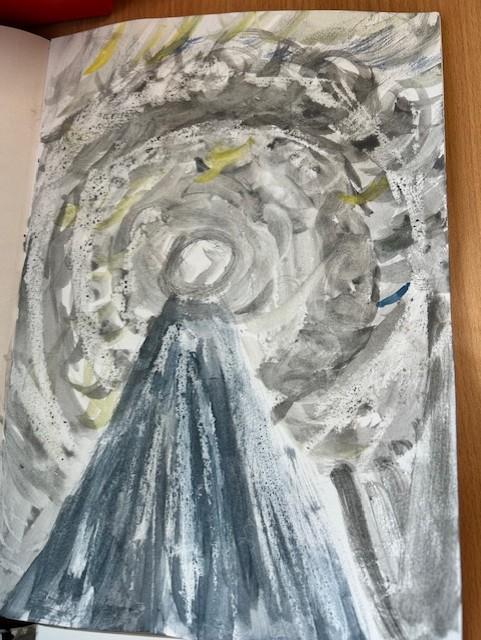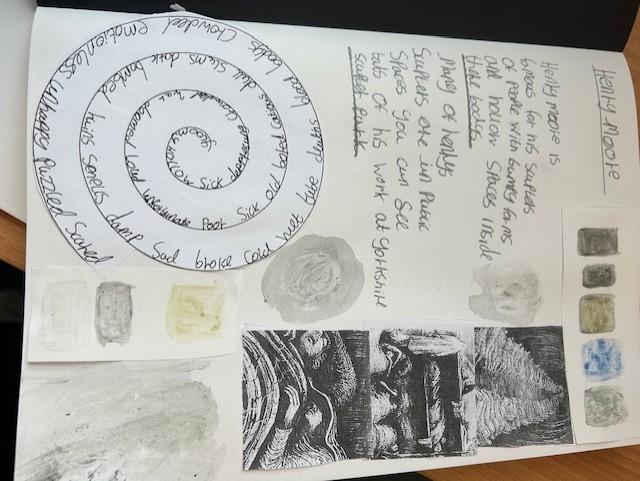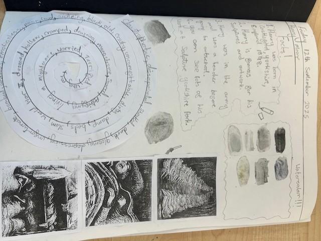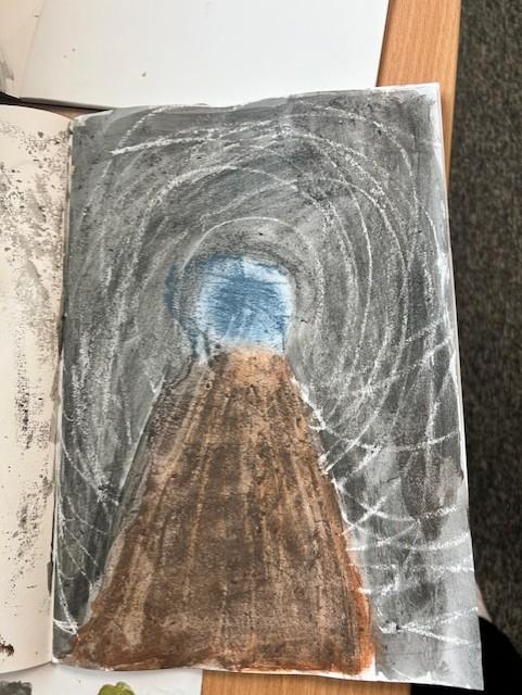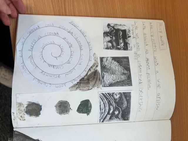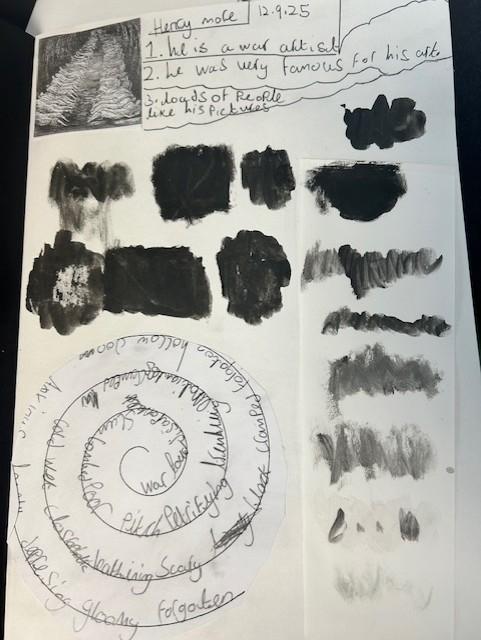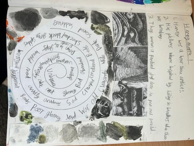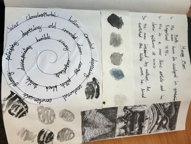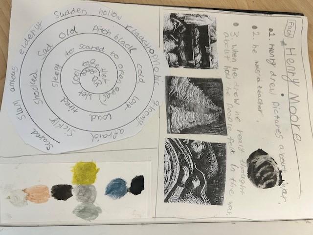 In art, we have been learning about Henry Moore who was commissioned as a War Artist during World War 2. He is famous foor his wax resist paintings of bomb shelters in public places. He attempted to portray the feeelings of anxiety and fear of the time period. Here are some pictures of our sketch books where we have researched Henry Moore and practiced his wax resist techniques, considering colour, tone and perspective.