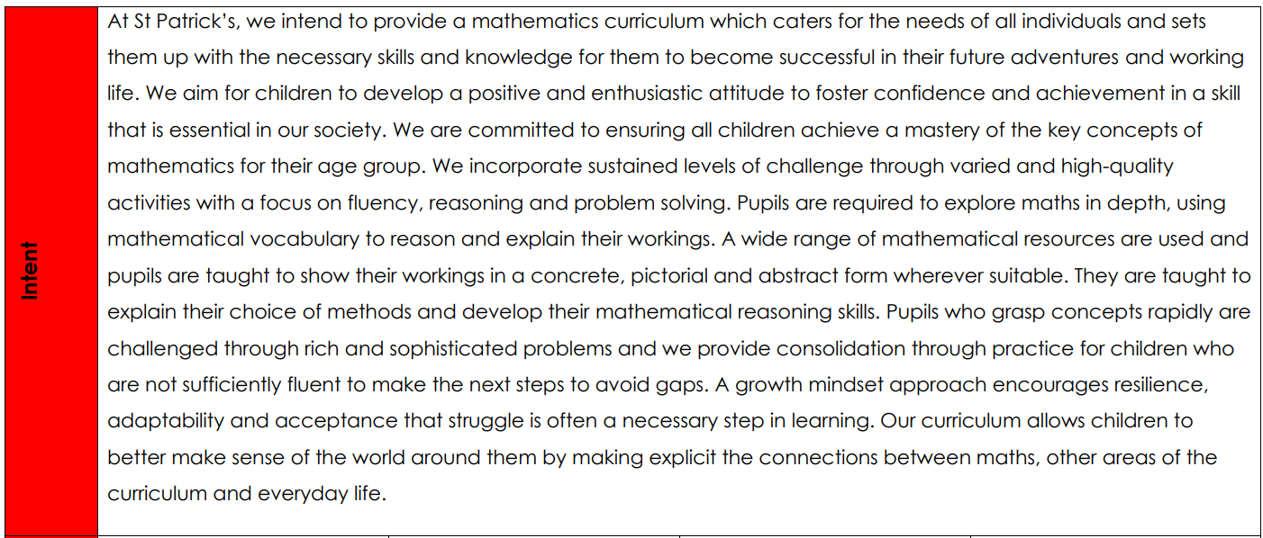 The Intent, Implementation and Impact document will give you a better idea of our aims and how we teach maths at St Patrick's Primary School.
